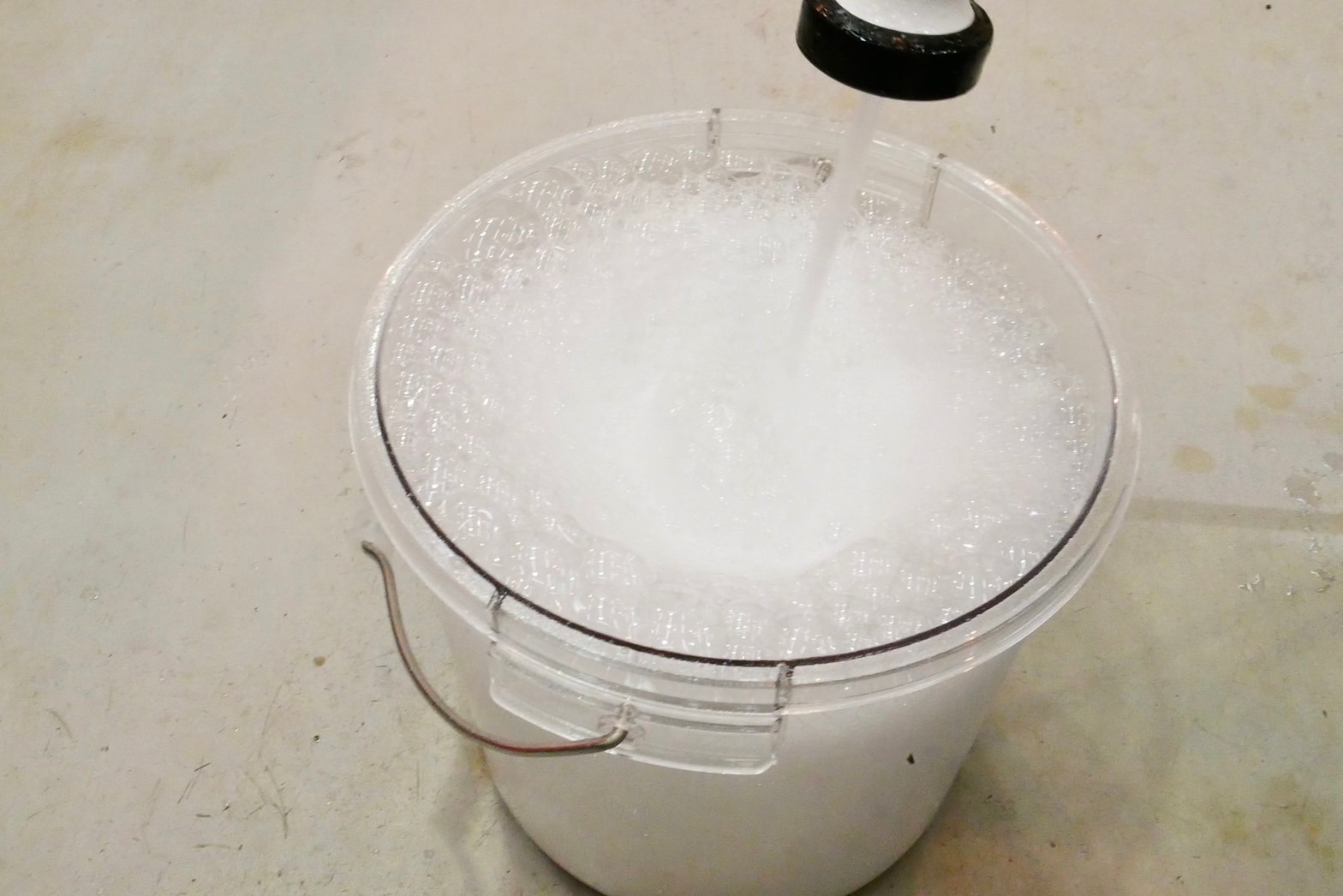 2,水量がバケツの半分を超えたくらいでシャワーにして泡立てることで大粒のきめ細やかな泡になります。