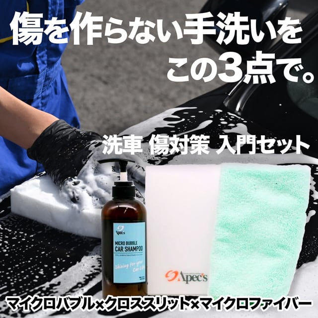 約20,000台以上のカーコーティング施工実績を誇る、日本屈指のカーコーティング専門店アペックスが、コーティング塗布直前の全ての油汚れを落とすために使用をしている『マイクロバブルカーシャンプー』『スリット入り洗車スポンジ』『ボディ用マイクロファイバークロス』がセットで登場!